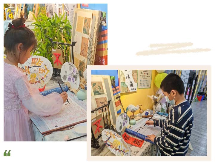 從書法角體驗區(qū)設(shè)置開始,就吸引了很多小學(xué)員的駐足觀看和體驗,在好奇心的驅(qū)動下,孩子們拿起毛筆,在紙上忘我的練習(xí)了起來,這是一場孩子們充滿意義的自主藝術(shù)探索。